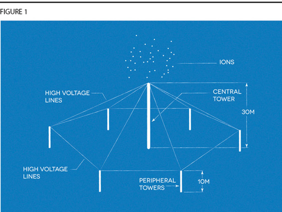 The basic idea is actually rather simple. This is a system of towers. You have a central tower, somewhere in the range of 30 meters (around 100 feet high), and then you have a series of smaller towers, around 10 meters high, surrounding it. These towers are then connected with rather thin wires, and through these wires, if you run the right high-voltage current, you can create an increase in the ionization effect in the surrounding atmosphere: what’s called a Corona discharge effect.