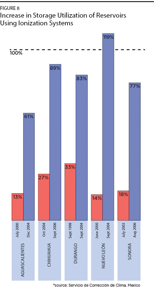 Here’s another graphic (Figure 8) illustrating the effect of filling reservoirs in a number of different states, around the nation of Mexico.6 The red shows how full the reservoirs were before the utilization of these systems; the blue shows how full the reservoirs were after the utilization of these stations. So, on the right, to give an example, that’s in the state of Sonora. So, the red there indicates the reservoir level in July 2003—it’s about 18% full. Three years later, after a few years of utilizing these systems, the reservoir level went to 77% full, as measured in August 2006. You see a similar result for different states.