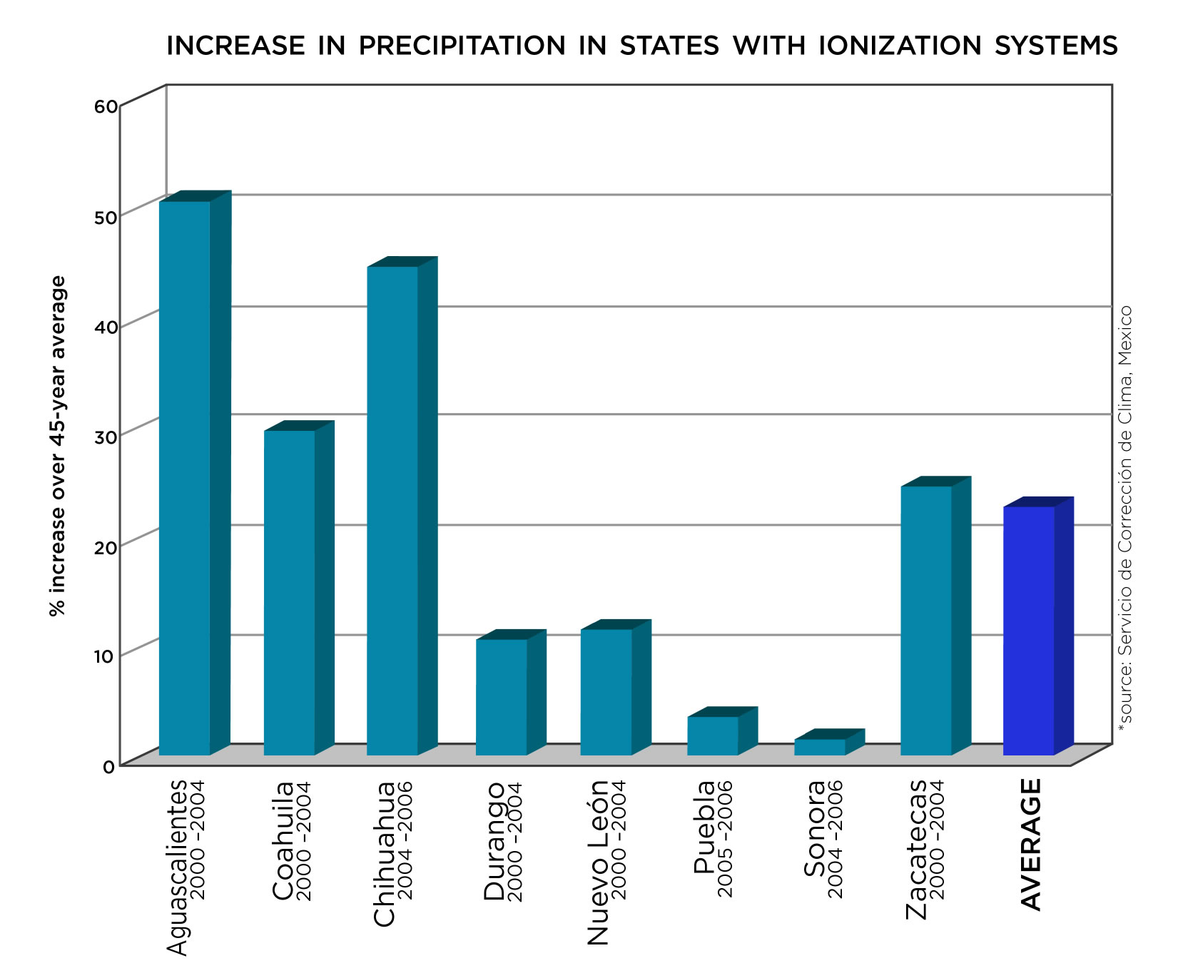 So, that’s what they expected. But then, when utilizing the system, the actual rainfall in the states was measured in blue. So you can see: ‘99, 2000, 2001, 2002, 2003—in five consecutive years of utilizing the systems, you had consistently significant increase in the precipitation above what was expected for the state of Durango.2
