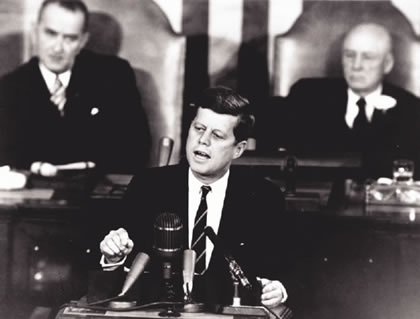 President John F. Kennedy, another visionary leader, announced on May 25, 1961 before a special joint session of Congress, the goal of sending an American safely to the Moon before the end of that decade. |