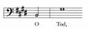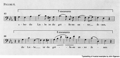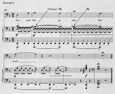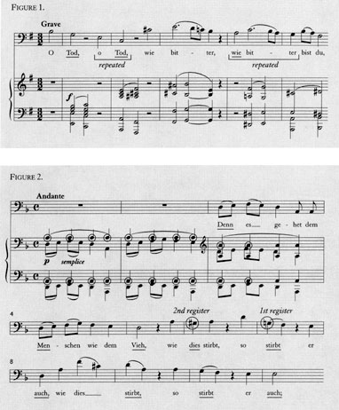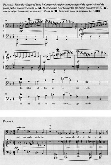 The displacement of accents, changes in timing and so forth, often produce a self-reflexive element in the development of the song, which unlocks the poetic effect, first in the development, and then in the broadening of the whole. So, for example, in the first song: Denn es gehet dem Menschen wie den Vieh (on the stressed beat), wie dies (stressed) stirbt, so stirbt (stressed) er auch (stressed), etc. (Or, in the English-language equivalent, in the words of the King James Version: "that which befalleth the sons of men befalleth beasts, ... as the one dieth, so dieth the other [also].") [see: Figure 2] Also, Brahms succeeds in creating an obvious deepening of the thought, by separating by three beats the two appearances of the word "stirbt" ("dies"), and letting the second appearance sink into the first register of the bass voice (G-natural). The motif of the singer's part is something carried forward from the first two measures of the piano part. Brahms lets the dominant tone A (in D minor), like an anchor, play virtually throughout, as a bass ostinato. One is reminded of the choral entrance in Bach's St. John Passion, in which Bachin the greater dimension of passionprepares the musical tension for the mighty choral entrance "Herr unser Herrschen" ("Lord our Ruler") through the close, stepwise movement of the violins and violas over the ostinato bass. Brahms develops various polyphonic usages, such as augmentation and canonic dialoguewhile preserving all the individuality of each songin order to make audible the organic unity of the whole. [see: Figure 3] Here it becomes clear, how Brahms deliberately seizes and develops aspects of the Bachian or Mozartian musical language, in order to motivically interlace the thought ''... es fährt alles an einen Ort ... es ist alles von Staub gemacht, und wird wieder Staub" ("all go to one place ... all are of the dust, and turn to dust again") with the closing thought "denn wer will ihn dahin bringen, daß er sehe, was nach ihm geschehen wird?" ("for who shall bring him [man] to see, what shall be after him?"). For augmentation of the theme and diminution of the note values were Bach's means to lawfully represent polyphonic thoughts via an increasingly closer spacing of different thematic entrances, as the musical work proceeds. (Bach's Musical Offering is examplary of this.) Brahms generates the musical intensity of the closing question of the First Song, "was nach ihm geschehen wird?" ("what shall be after him?") through the rhythmic change from the 3/4 meter of the reprise-like allegro part, to the 9/4 meter of the closing, proceeding along with the long note values, the equivalent of a long, sustained cry. In his recollections of Brahms, Ophüls also recalls the following observation by Brahms: "You simply wouldn't believe, how difficult it is to compose this unrhythmical Bible text." In teaching, as his student Gustav Jenner reports, Brahms advised the following for the process of composition: "Brahms demanded of a composer, first of all, that he know the text exactly. By that, of course, he was also to understand that by all means, the structure and meter of the poem be clear. Then he recommended to me, that I carry the poem I intended to set, around in my head for a long time, and that before composing it, I recite it aloud more frequently, thereby to pay exact attention to what the recitation entails in particular, especially taking note of the pauses, to retain this later for the work." Song 2 contains a dramatic example of a setting of a "pause." Just after the words, "Da lobte ich die Toten, die schon gestorben waren, mehr als die Lebendigen, die noch das Leben hatten; und der noch nicht ist" ("Therefore I praised the dead which are already dead more than the living which are yet alive, ... and they which have not yet been"), Brahms places a complete measure of rest for both voice and piano, and only then, after this sustained stillness of the "not-yet-been" ("Noch-nicht-sein"), concludes the verse: "ist besser als alle beide und das Bösen nicht inne wird, das unter die Sonne geschieht" ("better is he than both they, which have not yet been, who have not seen the evil work that is done under the sun"). [see: Figure 4] Throughout his life, Brahms intensively studied his musical forebears. For example, on Nov. 20, 1893, Brahms sent an astounding tabulation to Billroth, a friend of many years, following up a discussion about the predominance of major or minor in the pre-Bach period. Since Billroth asserted that the minor would predominate in all periods, just as in the oldest folk songs, Brahms drew up a list, which he called "statistical contributions pertaining to major and minor." He "classified," in this way, Bach's cantatas, 65 in major and 55 in minor, and in the same fashion the works of Beethoven, Haydn, and Mozart, as well as Clementi. Brahms laid out a similar "collection of interesting passages of the old masters," a technical study of passages from compositions of thirty-two composers, in which he gives an account of their uses of especially the intervals of the fifth and the octave. In the "Four Serious Songs," Brahms composed with a method of modal transformations which broke through the earlier uses of modality that had arisen in earlier stages of musical development, beginning with the "church modes" around the Sixteenth century, then through the establishment of a clear polarity between major and minor, which Beethoven then went beyond, in his late works (around Op. 132), using modes in a new way, to produce new expressive possibilities. An example is the closing phrase of the first of the Serious Songs: "Denn wer will ihn [here a change from 3/4 to 9/4] dahin bringen, daß er sehe, was nach ihm geschehen wird, was nach ihm geschehen wird?" ("For who shall bring him to see what shall be after him?") One hears a gradual changing over (through a piano trill) into the Dorian mode (measure 94, B-natural), then to D minor, wher