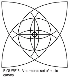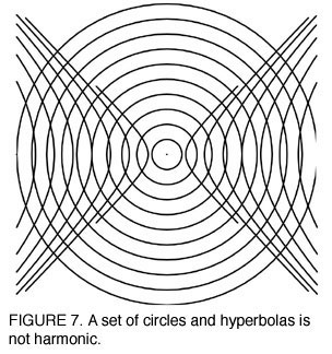 Note that, as the curvature on the hyperbola becomes less curved, so does the curvature on the corresponding ellipse, and at the same rate. Thus, harmonic functions relate two sets of different curves, such that the rate of change of their respective curvatures is always equal. (We could calculate this relationship precisely using Leibniz's calculus, but an intuitive understanding is sufficient for present purposes.) Furthermore, a set of harmonic functions need not be of familiar curves, such as circles, lines, ellipses, or hyperbolas. In fact, very complicated sets of functions can be harmonic [Figure 6]. By contrast, a set of circles and hyperbolas is not harmonic, because the curvature of the circle is constant, while the curvature of the hyperbola is changing. Consequently, the two sets of these curves are not orthogonal [Figure 7.]