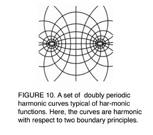 radial lines that intersect at the center of the circles, being transformed while maintaining their harmonic relationship. If the position of that intersection point changes, the radial lines must be transformed into circular arcs, and their end-points move along the boundary in order to maintain their harmonic relationship. In the animation, this effect is shown as the point of intersection moves, first away from the center, and then in a circular path around the center. This motion causes all positions inside the boundary to change as a whole. What doesn't change is the harmonic, i.e., least-action, relationship. This could also be thought of inversely: That the changes in position of the intersection of the radial lines at the boundary, cause their point of intersection to move in a circular arc, and their form to change from lines to circular arcs. Or, infinitesimally small changes in the curvature of the pathways are determined by the conditions at the boundary with respect to the position of the singularity. Compare this action with the change in the position of the lowest point of the catenary as the positions of the hanging points change, as illustrated in the animation Figure 1. There, a change in the boundary points produced a change along a single curve. Here, a change in the boundary curve produces a change in a set of harmonically related curves within a surface. Compare this with the problem Gauss confronted in, for example, determining the location of the Earth's magnetic poles from infinitesimally small changes in the Earth's magnetic effect. Gauss understood that those small changes were connected to the position of the singularities, i.e., magnetic poles, of the Earth's magnetic effect. However, the exact location, or even the number of those poles was still unknown in Gauss's time. On the basis of the measurements obtained by von Humboldt's network, Gauss determined where those poles must be located. The famous American Wilkes Expedition of 1837 was launched, in part, to confirm Gauss's findings, which it did. In Figure 9, this same effect is illustrated by moving the point of intersection of the radial lines along