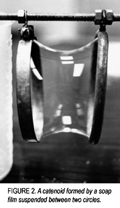 This example illustrates an aspect of the method that Leibniz originally called analysis situsor what Gauss and Carnot later called geometry of positionthat is relevant to an understanding of Riemann's Dirichlet's Principle. The positions of the individual links in the chain are a function of the relationship of the boundary conditions (positions of the hanging points, relative to the length of the chain) to the characteristic curvature of the principle of gravitation, and not by pair-wise relationships among the links themselves. In other words, the position of any individual link is not determined by a distance to the right or left, and a distance up or down, from its neighbors, as the Cartesians and Newtonians would insist. Rather, the position of each link is a function of the characteristic of change of the physical action as a whole. Any change in the boundary conditions, changes the position of every link, as a whole in conformity with the least-action principle of the catenary. Thus, the effect in the visible domain of the unseen physical principle, is expressed by the characteristic of change demanded by the principle of least-action. This is what determines the specific positions of the links. In other words, position is a function of change. Gauss recognized that the principles underlying geodesy and geomagnetism could be understood by an extension of Leibniz's method. He rejected the popularly accepted, but provably false method of Newton, which attempted to explain these phenomena as resulting from the pair-wise interaction of material bodies, according to the algebraic formula of the inverse square.3 Instead, Gauss insisted that these phenomena, as in the case of the catenary, must be understood as a unified process, in which the local variations in the position of the plumb bob or compass needle were a function of the characteristic of the principle governing the phenomenon as a whole. That whole, Gauss called the potential, which is the Latin equivalent of the Greek dynamis, or Leibniz's kraft (or Latin vis viva). Gauss invented the idea of a potential function, to express the least-action effect of the physical principle over an area or volume, in a similar, but extended manner to that used by Leibniz to express the effect of gravity in producing the curvature of the hanging chain. To accomplish this, Gauss extended Leibniz's idea of a function, into the complex domain. This transformed Leibniz's functionswhich characterized a single minimal pathwayinto Gauss's potential function, which characterized a whole class of minimal pathways: in effect, a function of functions. In other words, if Leibniz's catenary is understood to be a minimal pathway determined by one set of two functions, Gauss's potential function takes the next step, to a function that unifies two (or more) sets of functions. Riemann would later show that these sets of minimal pathways implicitly define minimal surfaces, as, for example, the catenoid formed by a soap film suspended between two circular rings [Figure 2.]