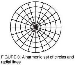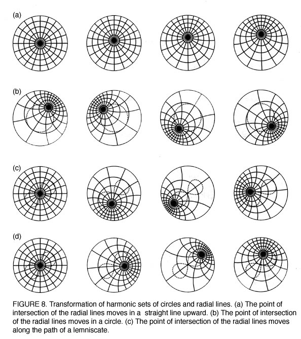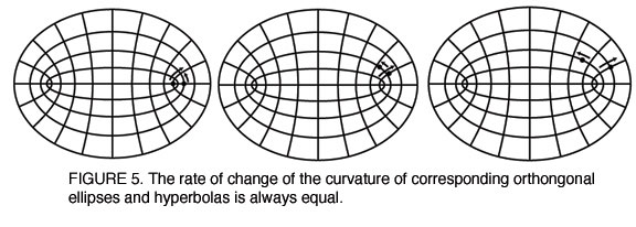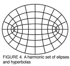 These sets of functions are not arbitrary. They are related by a special type of relationship, called by the descriptive names spherical or harmonic functions. A spherical or harmonic function is a set of orthogonal functions, all of whose curvatures are changing at the same rate. This can most easily be illustrated pedagogically with some geometric examples. A set of concentric circles and radial lines composes an harmonic function, because both the circles and the radial lines intersect orthogonally, and both have constant curvature [Figure 3]. A more illustrative example is a set of orthogonal ellipses and hyperbolas [Figure 4].