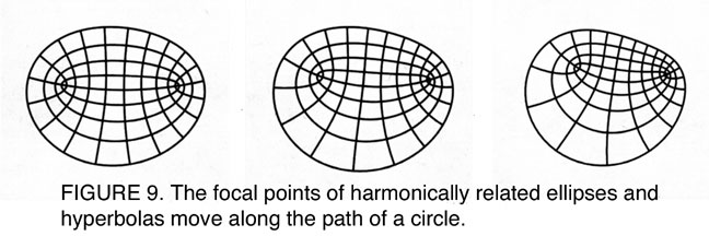 To get an intuitive grasp of their harmonic relationship, think through the following. Each ellipse is associated with a confocal orthogonal hyperbola. Beginning at the point where both curves meet the axis, create in your mind a connected action that moves simultaneously on both curves [Figure 5].