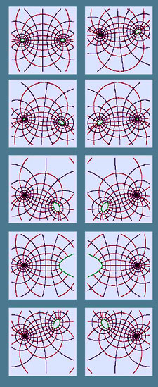 the path of a lemniscate. Notice again how this change in the position of the singularity, changes the condition at the boundary, so that all the resulting relationships remain harmonic.