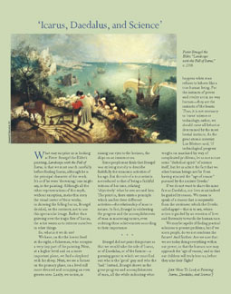 What may surprise us in looking at Pieter Bruegel the Elders painting, Landscape with the Fall of Icarus, is that we must search carefully before finding Icarus, although he is the principal character of the work. Its as if he were drowning, one might say, in the painting. Although all the other representations of this myth, without exception, make this story the visual center of their works, in showing the falling Icarus, Bruegel decided, on the contrary, not to use this spectacular image. Rather than grieving over the tragic fate of Icarus, the artist wants us to interest ourselves in other things. So, what is it we do see?