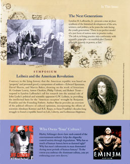 The intent of the issue, which features a groundbreaking symposium on "Leibniz and the American Revolution," is set forth by Lyndon LaRouche in his essay "The Next Generations," a tour de force synthesis of the historical development of the arts, sciences, and politics. LaRouche poses the challenge before today's youth, if they are to asssume their place in world history: