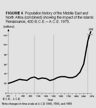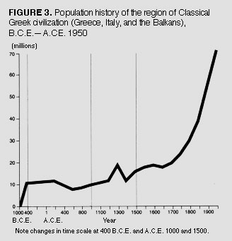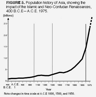 majority of the area most directly colonized by Greek Classical civilization. This small area came to include nearly ten percent of the entire human population by the end of an almost thousand-year impulse, because the population density of this area had tripled in the six hundred years from 1,000 B.C.E. to 400 B.C.E. at that time an extraordinary and completely unprecedented growth. By 400 B.C.E. , Classical Greece had achieved a population density of almost twenty-five people per square kilometer, and that is almost equal to the United States today, 2,500 years later. This density of human population was completely unique and unapproached by anywhere else at that time. This was a seafaring and city-building civilization; anyone who has read the history of Greece knows the absolutely extraordinary number of towns and cities which were built by colonization in this region of the world in a short time. Even Greek farmers lived in towns and cities, and went to their outlying fields each day, as many European farmers do today. It is clear that this impulse was broken in 400 B.C.E. , despite some continued growth, such that 1,600 years laterin A.C.E. 1200the population and population density of this region had only just come back to the same level. What stopped this renaissance was slaveryhelotry, as it was called in Greecethe spread of which caused the Peloponnesian Wars starting c.400 B.C.E. , the onset of plague, and the collapse of the population density. The Greek Isles, which had established a new level of potential population density for the entire world, then collapsed and did not recover the same level of population for more than two thousand years. Figure 4 shows the impact of the Islamic Renaissancewhich was the transmission belt into