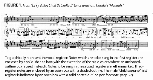 measures 14-19, supplied from the Messiah aria for tenor, Evry Valley Shall Be Exalted. We see the singer pass from his first registerthe lower part of his voicethrough his second or middle register to the third, his high register, on a single syllable of the verb exalted [measures 15-19]. We see the verb, shall be exalted, stated in four different ways in this text. In its first statement [measure 13], the singer moves from the second to the first register on shall be. In the next measure, he moves in the opposite direction, from his first register to his second, at precisely the same location. He is instructed by the composer to vary his declamation of shall be accordingly. For example, shall be, then shall be. A third variation occurs to each of these in measure 19, where shall be appears in a single vocal register, and is not broken between the first and second. This might be declaimed shall be. So we have the grouping shall be, shall be, and shall be. If we compare the singers declamation of the word exalted in measure 13 to that in measures 15-19, we discover that not only is exalted longer in the second instance, but that it is, as stated above, sung over three registers, instead of only one, as in measure 13. 'Exalted is sung differently a third time, over three vocal registers, but in one-and-a-half measures, instead of five [measures 19-20]. If we now list a grouping of the various declamations of shall be exalted, we have: