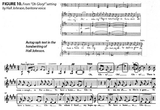 Each time the phrase is sung, it is sung in the same voice, that is, vocal register. There is variation in every other part of the song, in words and registration, but none in the refrain. In this way, the sameness of the refrain is used to accentuate Gods words, spoken as an ironic choral settingin that the One God is speaking, not a many-voiced chorus. There is no contradiction. Often, in both Classical drama and poetry, chorus is a single individual (for example, Shakespeares use of Gower at the beginning of Troilus and Cressida). This also reflects the singers role, as the voice of God, who uses his many voices and different shadings of voices, to assemble a drama, or at least several scenes of a drama, with a full cast of characters. These characters are transformed in a moment, or at most, a few moments, in the Classical setting of the Lied, or the Spiritual, through ironically-deployed poetic devices such as the refrain, onomatopeia, alliteration, and so forth. In the Go Down Moses example, the devices are used to juxtapose a narrative, with the uncanny statement of the word of God, who keeps interrupting the narration with the polemical demand, Let my people Go! The narrator can't get a word in edgewise. The mind is jarred by this, creating a necessity that the mind understand the unsaid idea behind the musical imagery. Thorough-CompositionHall Johnsons Oh, Glory! demonstrates the results of rigorous work on a musical idea, submitted to the test called among musicians thorough-composition. Here, although there may be the use of refrains, or other repeats, the composition is continuously changed, even ever so slightly, such that each phrase, even each syllable, is varied and re-formed. Although this can also be achieved in strict strophic settings, it enjoys a peculiarly rich rendering in thorough-compositon. In the Johnson setting of the Spiritual Oh, Glory! [Figure 10],