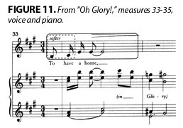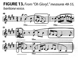 the increasing density of singularities is also recognizable. The text we use, apparently in the handwriting of Johnson, beautifully illustrates the rigor with which this principle can be deployed. Notice that the text reads, Oh, Glory! ... Oh! Glory! We can see, in the illustration of the register-shifts of the baritone voice, that Johnsons punctuation of the textin which he substitutes an exclamation point for the comma in the second Oh! Glory!is echoed in the corresponding shift in vocal registration. Also, again, the meaning of Oh is intensified by singing it the second time over two notes and two registers. The accompaniment in the piano is also shown to be a singing accompaniment [Figure 11].