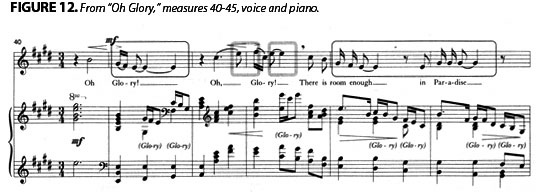 Here we see the accompaniment complete the unsung words of the singer. Instead of singing to have a home in glory, the singer abbreviates, and the piano finishes his thought. He sings to have a home, and the piano plays in Glory. A powerful antiphonal section follows, in which Glory is sung in a cascading polyphony by the piano chorus and the singer [Figure 12].