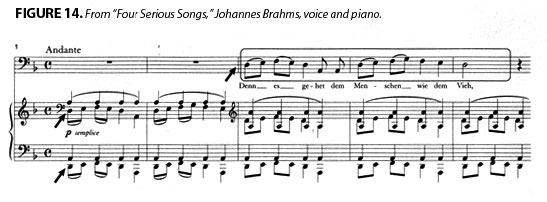 Of course, this is not so unusual, many songs start with an introduction. But, why reiterate glory three times, if introduction is the pianos sole function? In fact, there is no intoduction, no accompaniment in this piece, as there is no accompaniment in Brahms Four Serious Songs [Figure 14].