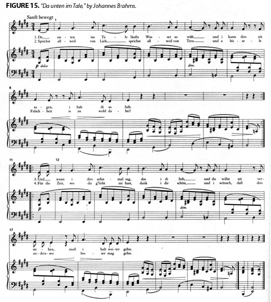 Instead, the piano is the chorus from which the voice of the singer emerges. The singer gives a soliloquy, evoking the chorus by means of his vocal registers. The piano increases its role, finishing the singers sentences. Finally, the singer abbreviates his message to Hm, and the piano-chorus supplies the four-part antiphonal answer to this message. This sort of musical composition, which was the method mastered by Brahms from his work on Beethoven and others, is the proper goal of any serious composer or arranger. It is a sign-post that points the direction to the origin of language in poetry, the which exists in a domain outside the boundary of any particuar language as such. Musical composition of this (Classical) type proves that meaning is above language, and originates language, not the other way around. Also, this implicitly proves that before man spoke, he sanga phenomenon we encounter regularly with young children of different nationalities who are able to communicate with one another in precisely this way. A different level, and one to which the work of Dvořák in America was clearly pointing, is seen in the Volkslieder setting by Brahms shown in Figure 15.