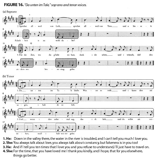 This selection is particularly good because it is also written in idiomatic German, and is therefore similar to the Spirituals. There are two speakers, a man and a woman, yet only one singing line. The man is lying to the woman, and the woman is aware that the man is lying, but protesting, resignedly, that she loves him, and wishes the one that the man now loves, and is betraying her with, the best. Yet, there is only one melodic line, with which these opposing views must be transmitted. The line must be a metaphor, incommensurable with either state of mind, but encompassing bothand other qualities besides [measures 1-8]. We analyze the text as though set for a tenor and soprano. Look at the text, and its use of registration and register shifts, to underscore the irony of the dramatic action. For example, look at the womans Sprichst [opening measure], is au wohl dabei [measure 7-8], wo besser mag gehn [measure 18-19]all points of verbal action, or change, in the narrative [ Figure 16(a)].