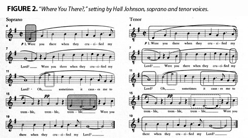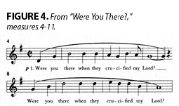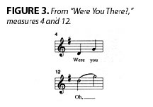 illustrates a setting of the Spiritual Were You There, by Hall Johnson. It is a strophic setting, that is, one in which the vocal line, and the accompaniment, are unvaried over the four verses of the poem-text. The text is here illustrated in the key required for a tenor or soprano, and the register shifts for the two voices are indicated. Notice the first two notes of the piece, at the beginning [measure 5]. A register shift creates the idea, were you there ... ?. Compare this to the two notes on the word Oh, in measure 13. They are the same two notes, moved up one octave. And here, again, as on the first two notes of the piece, there is a shift in register, in voice for both the tenor and soprano.* There is another difference in the notes, other than the change from one octave to another. For Oh, each note is twice as long as for were you ... ? [ Figure 3],