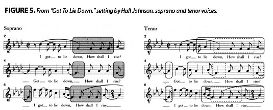 Compare the second line entrance of were to that of were in the first line. We see the tone G is used in the second exactly as the tone D is used in the first line. So, there is no magical quality to the note G that gives it the particular significance we attached to it above. However, if we study the interval relationships in this piecethat is, for example, the interval of a fourth that is used at the beginning [measure 5], and then on Oh [measure 13], and finally again in the last line [measure 19], we can understand the difference in the use of the tone G that we are contending. In the second line, the interval for Were you is not a fourth, but a third [measure 9]. The interval of a fourth occurs at a point of singularity. It occurs at the songs beginning, at the register shift of the soprano. It occurs in the middle at the register shift of the soprano and tenor. It occurs at the tenor register shift from first to second register, in the final line as we indicated above. This is not the interval of the beginning of the second line, however. Therefore, the second line is different. The fourth occurs at the tenor register shift in the third line [measure 19]. And, it is the declamation of the Oh by means of the interval of a fourth, that establishes the meaning of the tone G for the piece. Notice that, throughout the entire piece, the only time that more than one note is sung on any word is on Oh, and that occurs at a register shift. Oh is clearly the word most imbued with content, in terms of the Johnson setting. The interval of a fourth is also used as the interval across poetic lines. Review again measures 5-8 and 9-12, as shown in Figure 4. As stated before, the first note of the first poetic line is D, the second G. That means that the poetic lines span the interval of a fourth. When Oh is sounded, we are caused to hear both poetic lines simultaneously, because of the use of the fourth. It is also easy for us to experience this, because the words are exactly the same in each line. This intensifies, by condensation, the poetic meaning. What was said in eight measures is now said in one. A greater density is achieved. This can be visually captured by reviewing, in succession, measures 5, 9, 13, and 19. Not only a greater density, however. Let us now look at the line, Oh, it causes me to tremble, tremble, tremble. This line spans all three vocal registers of both the soprano and tenor voice [measures 13-19].(The trained tenor also has the opportunity to poetically re-create the lower soprano shift here, thus creating the impression of four voices rather than three.) The Spiritual I Got To Lie Down, as arranged by Hall Johnson, demonstrates another use of onomatopeia [ Figure 5].