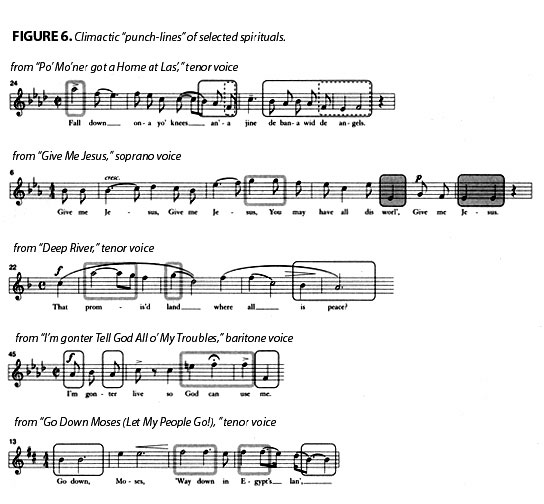 The musical line falls on the imperative, I got to lie down, and rises on the question, How shall I rise? This is onomatopeia, and occurs the first and third times the paradox is stated [measures 2-3 and 6-7]. Now, refer to the soprano registral setting. Look at the word down. Note that the first time it is sung, it is declaimed on one note [measure 3], the second time, on two notes [measure 5], and the third time, on three notes [measure 7]. This is a second use of onomateopeia. Finally, irony is used as a poetic device: the second time How shall I rise? is sung, rise does not rise, but falls [measure 5]. The paradox contained in the question, is now condensed in the irony of the verb, rise, falling. Sung properly, this song creates an unrelenting tension, fueled by the devices indicated in the setting of the opening refrain. In many Spirituals, it can be demonstrated that the same condensation and increase of density occurs. Space limitations prevent us from doing more than giving examples of this. We illustrate here the climactic lineswhat one could crudely call the punch-linesof several Spirituals for this purpose [Figure 6].