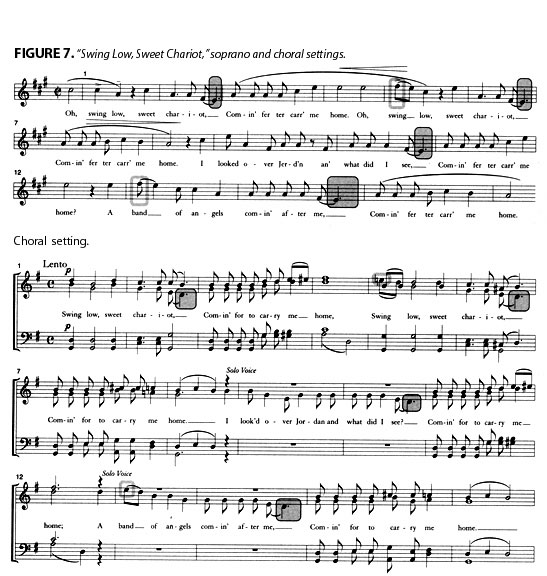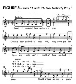 We compare Hall Johnsons setting of Swing Low, Sweet Chariot, with a choral setting by another arranger/composer. Johnsons setting is treated for the soprano voice. In the choral version, the melody line is contained in the alto (better referred to as mezzo-soprano) line, the line second from the top in the treble clef. Notice that the registral breaks are identical for the soprano voice of Johnsons setting, and the mezzo-soprano treatment of the choral version: see chariot [measure 2], swing [measure 5], see [measure 11], band [[measure 14], etc., to get an idea of this. In a second example, I Couldn' Hear Nobody Pray [ Figure 8],