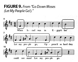the text is scored with the option that two singers, in this case two tenors, two sopranos, or a tenor and soprano, could sing it together, creating the projected image of a chorus (see Oh, Lord [measure 4], and the text marked verses above the staff [measure 10]). In another variation, one singer could imitate such a chorus by singing the parts himself. Sometimes this song is performed with the piano accompaniment playing the refrain couldn't hear nobody pray, without the verses In the valley, On ma knees, etc. Finally, in Go Down Moses, we see the choral refrain fully integrated into the text itself, Let my people go [Figure 9].