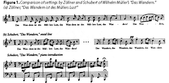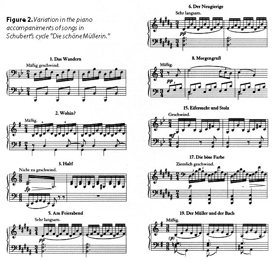 While Zöllner correctly sets the word Wandern (long-short syllables, with a falling tone from the first to the second syllable), Schubert subjects the word to a development, so that not until the end of the strophe does it fit in terms of speech and melody. Schubert musically condenses the poem's germinal idea, from prelude to sequel, in four measures. Above the octave figure in the bass, the right-hand piano part plays a sixteenth-note figure, closely related in terms of motif to the voice line. In contrast to Zöllner, whose song mimics the stride of a wanderer, Schubert has not made a wanderer song out of the poem; it is impossible to sing his lied while you are hiking. Schubert's Das Wandern has a wholly different meaning; it is the driving upbeat for the entire Schöne Müllerin cycle, the starting-point of a journey to a higher level of mind and soul. On this journey, we focus on the central motivic idea, already expressed in Das Wandern, which underlies all twenty lieder. Schubert musically varied the setting of each poem, according to its content and mood, by means of key, tempo, dynamics, and so forth, producing a theme with variations29 [ Figure 2, noting the variations in the accompaniment, etc.]. [TYPESETTER: FLAT SYMBOL