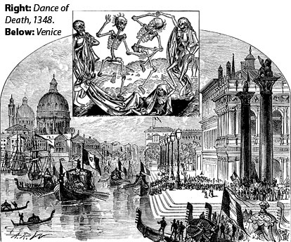 What was the effect of this Venetian global currency speculation on the European economies before the 1340s crash and the Black Death? It was the short-term vise that caught the other European bankers and rigged the crash itself. From 1275-1325, the ratio of the average gold price, to the average silver price, steadily rose, though with continual short-term fluctuations, from about 8:1 to, finally, about 15:1. In this period, Europes large production of silver was looted through Venices command of Mongol and African gold. Venice had the central position as the worlds bullion market, writes Lane, and attracted to the Rialto [Venices Wall StreetPBG] the acceleration of buying and selling stimulated by the changing prices of the two precious metals. From 1290 into the 1330s, prices rose sharply for the most crucial commodities. In this process of quickening speculation, Venice ensnared all the surrounding economies, including the German economy where production of silver, iron, and iron implements was concentrated. By the 1320s, Venetian merchants no longer even travelled to Germany to trade: they compelled German producers and merchants to come to Venice and take up lodgings near the large Fondaco dei Tedeschi (Warehouse of the Germans) where their goods were stored for sale. Venetian bankers on the Rialto (and Venetian bankers alone in the world at this time) made cashless bank transfers among merchants' accounts, allowed overdrafts, gave credit lines on the spot, created bank money, and speculated with it. They did this not out of cleverness, but by simple control of currency speculation worldwide: they had the reserves. In fact, the famous bills of exchange of the Florentine bankers, were really a crude form of the derivatives contracts of the 1990s speculative cancer. The Bardi et al. charged fees to those involved in trade, for exchanging currencies, since there were so many regional and city currencies. These exchange fees were a cost looted out of all production and trade, and a usurious profit to the bankers. But the banker made the bills of exchange even more expensive, to hedge against their own potential losses in currency fluctuations being manipulated by Venetian bullion merchants. Thus bills of exchange in the Fourteenth-century cost 14 percent on average, worse than borrowing at interest (usury). Venice switched Europe to gold by force of looting silver. England, for example, from 1300-1309 imported 90,000 pounds-sterling in silver for coining; but from 1330-1339, it was only able to import 1,000 pounds. But in Venice there was no lack of silver at all in the 1330s. The Florentine bankers, with their famous gold florin, enjoyed great speculative profits in this process. However, from 1325-1345, the process was reversed. The ratio of gold price to silver price, dominated by Venetian manipulation, now fell steadily from the 15:1 level, back down to 9:1. When the price of silver started rising in the 1330s, there was an unusually large supply of silver in Venice! And through the 1340s, the international exchange of gold and silver greatly intensified again, Lane shows, and there was another wave of sharp commodity price increases. Now the Florentine bankers were caught, having loans and investments all over Europe in gold, whose price was now falling. After Venice triggered the fall of gold with new coins in the late 1320s, the Florentines did not attempt to follow suit until 1334 when it was too late; the King of France did not follow until 1337; and last came the pathetic effort of the King of England in 1340, mentioned above. As Lane shows: The fall of gold, to which the Venetians had contributed so much by their vigorous export of silver and import of gold, and in which they found profits, hurt the Florentines. In spite of their being the leaders of international finance ... the Florentines were not in a position, as were the Venetians, to take advantage of the changes that took place between 1325 and 1345. Venetian super-profits in global currency speculation continued right through the bank crash and financial market disintegration of 1345-47 which they had rigged, and beyond. In the period 1330-1350, the Black Death had spread through southern China, killing between 15 and 20 million people, as the Mongols' looting process came to exhaustion. The Mongols' horse culture (they grazed huge herds of horses for hunting and warfare) had destroyed the infrastructure of agriculture wherever they went. It had also moved the population of plague-carrying rodents from the small area of northwest China where it had been isolated for centuries, down into southern China and westward all the way to the Black Sea. In 1346, Mongol cavalry spread the Black Death to towns in the Crimea, on the Black Sea, and from there it was carried by ship to Sicily and Italy in 1347, and spread throughout Europe. The European population had stagnated for forty years while becoming more concentrated into cities, where water and sanitation infrastructure had decayed. In Florence, for example, all the citys bridges had been built in the Thirteenth century, none in the Fourteenth. Nutritional levels had already fallen as grain production declined. During the Crusades, the practice of Classical education in monasteries had been viciously attacked by the preacher of the Crusades, Bernard of Clairvaux, and his Cistercian order. In 1225, the Papacy had finally forbidden the presence of young studentsoblatesin monasteries. Europes broadest form of education had disappeared. After the financial crash and the entry of the plague, Europes population fell for a hundred years, from perhaps 90 million, to roughly 60 million. No More Venetian MethodsThe marked price rises in the aftermath of the Black Death and subsequent epidemics, lasted more than a generation. This then led to a sharp deflation and collapse of wages from about 1380. After 1400, in the years which led to the Golden Renaissance, political forces turne