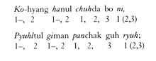 "Thoughts of My Homeland (Kohyang Saeng-gak)," a quite Schubertian piece by Dr. Hyun Jae-myung (Rody Hyun) (1902-1960), shows the typical Korean trochaic rhythm and its tendency to fall into a dactylic triple meter. In the poem, also by Dr. Hyun, the key second verse, which speaks of his homeland (kohyang) begins in trochaic and winds up in dactylic: