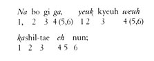 Every letter ends in a vowel sound, and no consonants stand alone, yielding a vowel-based pattern similiar to Italian. The Korean Lyric Songs make use of these "vowel melodies" in Classical style. For example, compare to "Ave Maria" and "Sonntag," the passage in "Azaleas": "Yongbyon ui yak san chindalrae-ggot (At Yongbyon the mountain-blooming azaleas)" [see: Figure 13]. The melody begins in the first register on the repeated lower /o/ sound of the town, Yongbyon; then rises into the second register on the higher vowel sounds of /i/ and /a/ in "ui yak san chin"; and then falls back to the first register on the /o/ of "ggot" (flower).