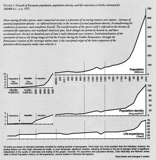 This shows the effect of a fundamental distinction of the human species from all lower forms of life. That long-term view shows us two most significant general facts. First, man is the only species which has been able to willfully increase, successively, what I have defined as its potential relative population-density. Second, the greatest rate of such increase has been a product of the cultural changes introduced into and by European civilization beginning the great, Golden Renaissance of the mid-Fifteenth century.