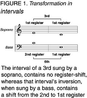 But if you take the standpoint of vocal polyphony, octaves are not at all equivalent: Replacing a note by its octave transforms all the relationships among the different voices! Firstly, I end up in a different register of the voice, or even in a different voice. Secondly, I transform the intervals between the voices. For example: a third becomes a sixth, and a fifth becomes a fourth, and vice-versa [ Figure 1].