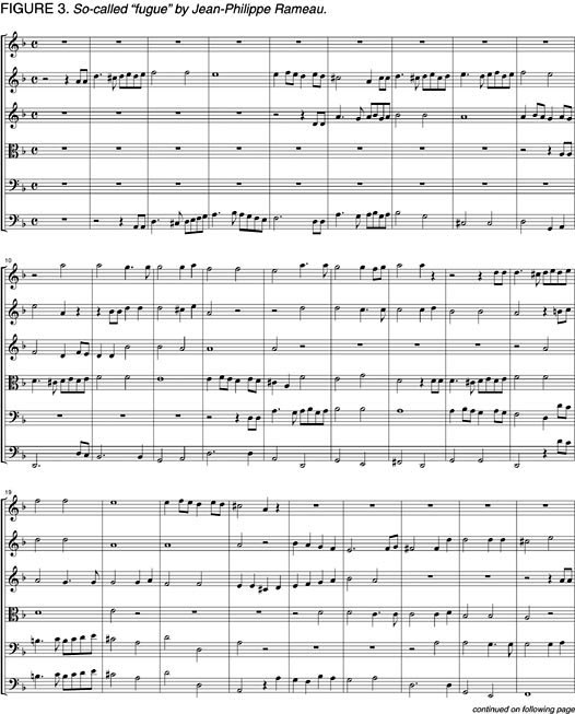 At first hearing, it sounds nice, and you can be fooled by Rameau, who is skillful at creating harmonic sound-effects and putting short counterpoint imitations in. But it is not a fugue, because there is no dialogue, no tension between the voices. Not surprising, because in Rameau's theory the voices have no real existence; they are essentially devised after the basic outline of the composition has been finished, to fill in the spaces between the chords, as Chopin pointed out.