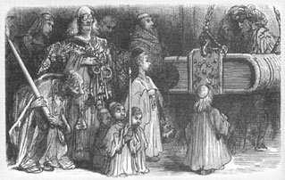 The people so pestered him, in fact, that he was compelled to take a rest on the towers of Notre-Dame; and when from there he saw so many, pressing all around him, he said in a clear voice:I think those clodhoppers want me to pay for my kind reception and offer them a solatium. They are quite justified, and I am going to give them some wine, to buy my welcome. But only in sport, par ris.
