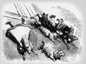 The dealer, in his alarm at seeing his sheep perish by drowning, tried to prevent them and held them back with all his might. But it was useless. They all jumped into the sea, one after another, and were drowned. Finally Dingdong clutched hold of one great, strong ram by the fleece. He was up on the forward deck, and thought that if he could hold this one back he would save the rest. But the ram was so strong that he carried the dealer overboard with him in much the same way as the sheep of Polyphemus, the one-eyed Cyclops, carried Ulysses and his companions out of the cave. Dingdong was drowned, as were the rest of the shepherds and drovers, who seized the sheep, some by the horns, others by the legs, and others by the fleece, and were dragged into the water also, where they perished miserably. ...