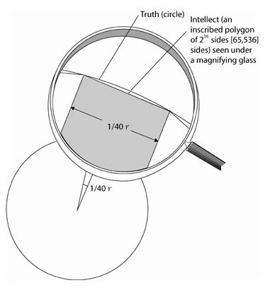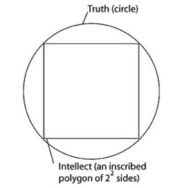 One of the most critical comments on Euclids Book III, Proposition 16 was made by Johannes Campanus, who edited Euclids Elements in the Thirteenth century. He inferred from III.16 that there was a flaw in the principle that the transition from the less to the greater, or vice versa, takes place through all intermediate quantities, and therefore through the equal. If a diameter of a circle, he says, be moved about its extremity until it takes the position of the tangent to that circle, then, as long as it cuts the circle, it makes an acute angle less than the angle of a semicircle; but the moment it ceases to cut, it makes a right angle greater than the same angle of a semicircle. The rectilineal angle is never, during the transition, equal to the angle of a semi-circle. There is therefore an apparent inconsistency with Book X, Proposition 1, and Campanus could only observe in explanation of the paradox, that these are not angles in the same sense, for the curved and the straight are not things of the same kind without qualification. There is every reason to believe that Cusanus had access to Campanuss edition of Euclid. Moreover, this is the same issue that Cusanus refers to in the passage in Book III, chapter I of On Learned Ignorance cited at the beginning of this article. Cusanus refers to this logical paradox as a certain singularity. In 1557, the French geometer Peletier, argued that the angle of contact was not an angle at all. He claimed that the contact of a straight line with a circle is not a quantity, and that angles contained by a diameter and a circumference are all right angles and equal to rectilineal right angles. For Peletier, there was no difficulty with Euclids Book X, Proposition 1, because all angles of contact are not-angles, not quantities, and therefore nothings. Vieta (1540-1603) agreed with Peletier that the angle of contact is no angle. His pseudo-proof was that the circle may be regarded as a plane figure with an infinite number of sides and angles; but a straight line touching a straight line, however short it may be, will coincide with the straight line and will not make an angle. In other words, if the circle is a straight line in the infinitely small, then there is no angle at the point of contact with the tangent. Not surprisingly, this was also the view of Galileo Galilei (1564-1642). This issue is in no way esoteric or academic; rather, it is one of the most profound issues confronting man. The cornicular angle is either equal to null, as the Aristotelians maintain, or it is virtually null, but nonetheless exists, and in fact has greater being and reality than the polygon which is derived from it. If the former is true, then the same argument can be made (and in fact has been made) theologically, that neither God nor the human soul exists. If the circle is no more than a polygon with an infinite number of sides, then God is equal to His creation (which is the basis of pantheism), and the soul is not immortal, but rather dies with the body. This is the same issue as that which later divided Gottfried Wilhelm Leibniz (1646-1716) and Leonhard Euler (1707-83). Leibniz insisted that monads, or simple substances, are indestructible and indivisible. Euler, on the other hand, had lyingly argued that all magnitude is divisible to infinity. To return to Nicolaus of Cusas argument: If one recognizes the existence of incidental angles, and understands that an incidental angle is not commensurable with a rectilinear angle, then it is clear that there can be no rational proportion between the area of a circle, and a rectilinearly enclosed area. As Cusanus writes: If a circle can be transformed into a square, then it necessarily follows, that its segments can be transformed into rectilinearly enclosed figures. And since the latter is impossible, the former, from which it was deduced, must also be impossible. Obviously, then, the semicircle cannot be transformed into a rectilinearly enclosed figure, and consequently also not the circle or one of its parts.Similarly, Cusanus writes in respect to contingent or cornicular angles that, although they cannot be divided by another straight line, they are nonetheless divisible by another curved line: The contingent angle is a divisible magnitude only in its species, since to every contingent angle there is a larger and a smaller contingent angle. Species DifferenceThrough this discussion of the incommensurability of incidental and contingent angles to rectilinear ones, Cusanus proves that the circle cannot be squared, because polygonal figures are not magnitudes of the same species as the circular figure: In respect to things which admit of a larger and smaller, one does not come to an absolute maximum in existence and potentiality. Namely, in comparison to the polygons, which admit of a larger and smaller, and thereby do not attain to the circles area, the area of a circle is the absolute maximum, just as numerals do not attain the power of comprehension of unity and multiplicities do not attain the power of the simple.What is significant about this statement is, that Cusanus has identified the fact that the circle is of a higher power, or cardinality, than the polygon. The circle is a true infinite. As such, it does not admit of greater or less, as does the polygon. The area of the circle is thus simultaneously maximal and minimal. Moreover, it is in actuality all that it is potentially. The circle transcends the polygon in the same way that unity transcends numerals, and the simple transcends multiplicities. The latter cannot attain to the former; nonetheless, the former are present in the latter, as the cause is present in its effect. Cusanus goes on to say that some consider the square equal to the circle, if it is not larger or smaller than the circle by the smallest specifiable fraction of the square or the circle: If one apprehends the concept of equality in this way, then it is justly said that one can give an equal c