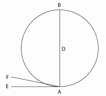 According to this proposition, if a straight line touches a circle at one point only, i.e., is tangent, then any other straight line which one attempted to interpose between that tangent and the circumference, would necessarily cut the circumference in two points, and thus fall within it [See Figure 10].