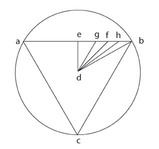 In Euclids Book XII, Proposition 2, this Eudoxian method of exhaustion is applied first to a polygon inscribed within a circle, and then to a polygon circumscribed around a circle. According to this proposition, we can exhaust a circle, in the sense of Book X, Proposition 1, by successively inscribing in it regular polygons, each of which has twice as many sides as the preceding one. We take an inscribed square, bisect the arcs subtended by the sides, and form an equilateral polygon of eight sides. We do the same with the latter, forming a polygon of 16 sides, and so on. As we shall see, what is left over when any one of these polygons is taken away from the circle, is more than half exhausted when the next polygon is made and subtracted from the circle. This is proven by the fact that the square is greater than half the circle, and the regular octagon, when subtracted, takes away more than half of what was left by the square. Take an arc of a circle cut off by a chord AB [See Figure 3].