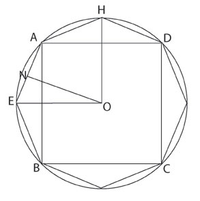 Let AE be any side of it, and ON the perpendicular on AE from the center O [See Figure 6]. Then, ON is less than the radius of the circle, and therefore less than one of the sides about the right angle in K. But, the perimeter of the polygon is less than the circumference of the circle, i.e., less than the other side about the right angle in K. Therefore, the area of the polygon is less than K; which is inconsistent with the hypothesis. In the case where the circle is less than K, Archimedes directs: Circumscribe a square, and let two adjacent sides, touching the circle in E and H, meet in T [See Figure 7]. Bisect the arcs between adjacent points of contact and draw the tangents at the points of bisection. Let A be the middle point of the arc EH, and FAG the tangent at A. Then the angle TAG is a right angle. Therefore TG is greater than GA and greater than GH.