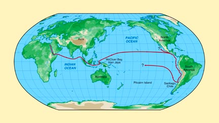 Why did 1,723 years pass between the discovery, or declaration of discovery of South America by the navigator Maui, and the similar discovery, the similar voyage of exploration, conducted by Columbus? The argument essentially is this: Sometimes, in the course of history or scientific investigation, one is presented with a very fascinating and very challenging pattern of evidence. But, it's not yet conclusive. It teases you, it tempts you, it draws you into the subject matter. But, you can not finally draw a conclusion which settles the argument. It's something like a dog lurking in your backyardit's just there all the time. You don't know to whom it belongs, you just know it's there. And you wait for its master to come by and claim it one day, or something else to happen, so that you may identify to whom this dog belongs. Such is the nature of the matter we're dealing with today. We'll start with the overall map, and we'll refer to this repeatedly [see: Figure 1]. Now, the subject, the apparent subject, which is extremely tempting, and is especially tempting because there is an "eye" in this right away in Jonathan's sense, to begin with, is that a group of mariners under Egyptian direction, from an area then of Egypt, now of Libya, called Cyrenaica, set sail in a flotilla of ships which went down the Nile River and out to the Red Sea through a famous canal, which at that time connected the Nile River to the Red Sea. |