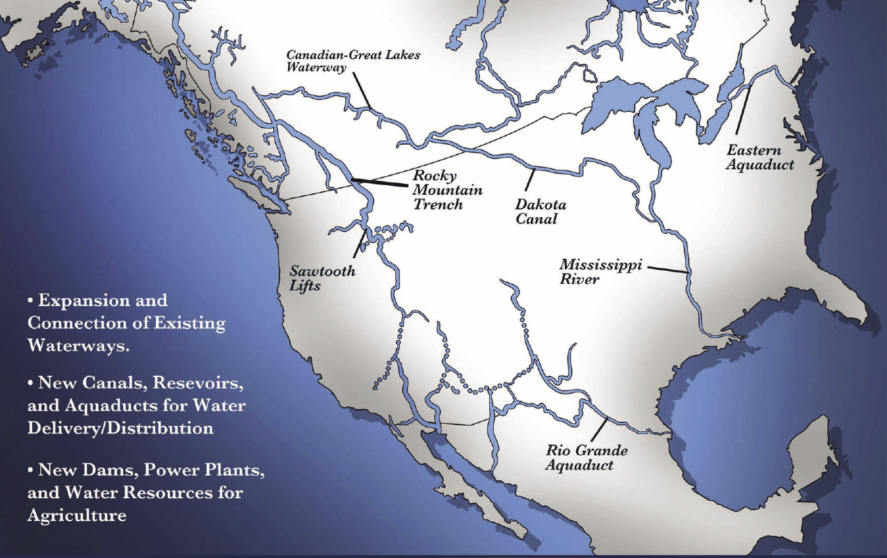 (c) Launch the necessary nation-building projects, foremost of which is NAWAPA XXI, the updated version of the 1960s, Kennedy-era North American Water and Power Alliance. The concept diverts a portion of Arctic-flowing water from the Northwest of our continent, southward through Canada, the western United States, and as far South as Mexico. This 20-year plan not only alleviates drought, and regulates flows for navigation and all purposes, but creates upwards of 6 million jobs in the U.S., and a demand for heavy manufacturing inputs and a skilled workforce once again. The rolls of 48 million poor Americans dependent on food relief will shrink to zero. Canada and Mexico will prosper.