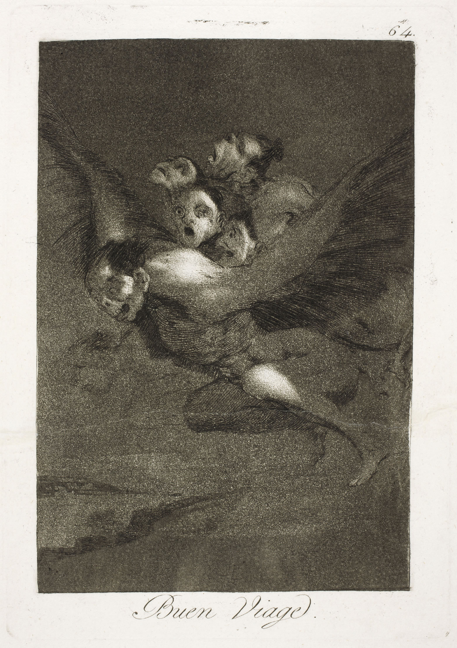 ![]() View full size Bon voyage, Capricho no. 64, which Goya captions: “Where is this infernal company going, filling the air with noise in the darkness of night? If it were daytime it would be quite a different matter and gun shots would bring the whole group of them to the ground; but as it is night, no one can see them.” |