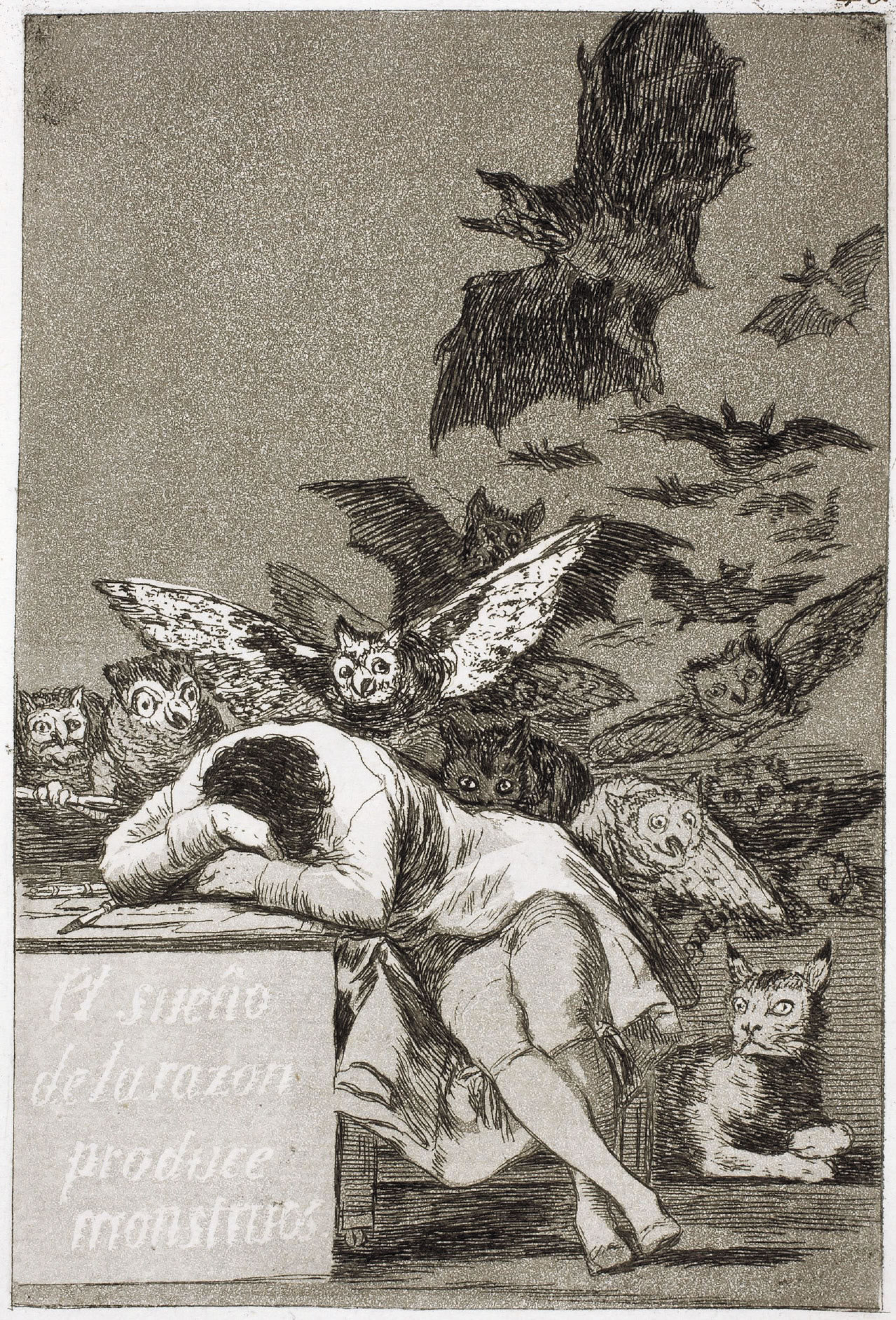 The sleep of reason produces monsters, by Francisco Goya, no. 43 of his Los Caprichos, 1799. Goya’s caption reads: “Imagination abandoned by reason produces impossible monsters: united with her, she is the mother of the arts and the source of their wonders.” |