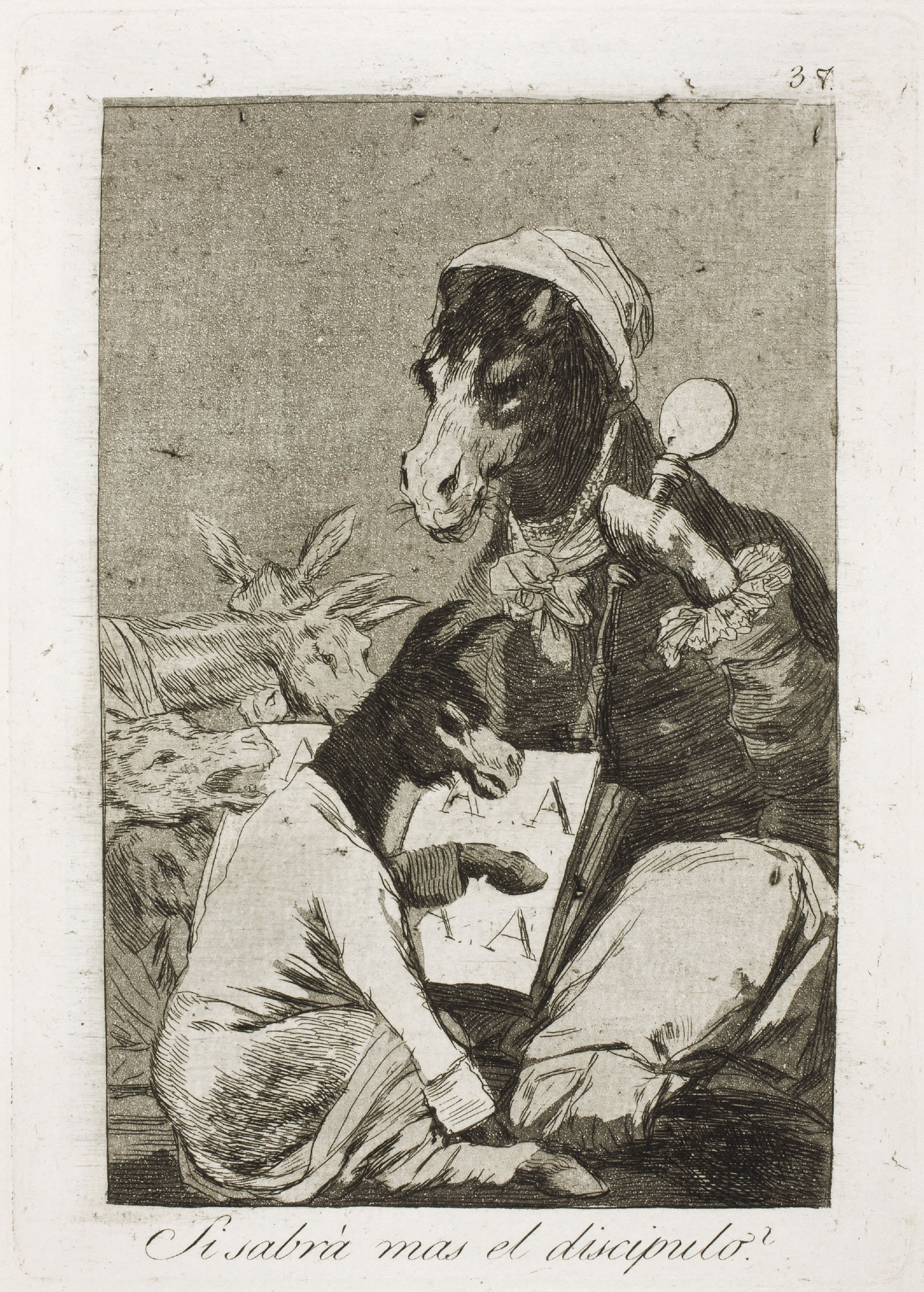 ![]() View full size Might not the pupil know more? Caprichos no. 37, which Goya captions: “One cannot say whether he knows more or less; what is certain is that the master is the most serious-looking person who could possibly be found.” |