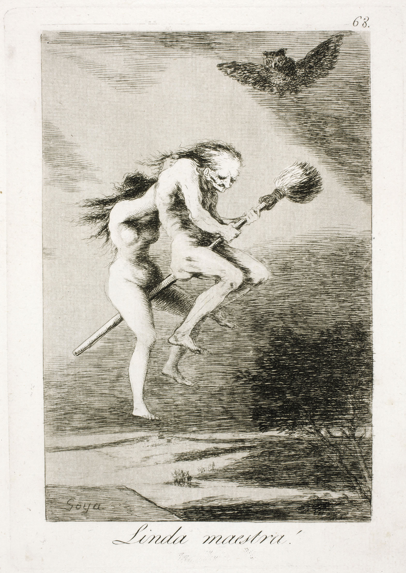 ![]() View full size Pretty teacher! Capricho no. 68, which Goya captions: “The broom is one of the most necessary implements for witches; for besides being great sweepers, as the stories tell, they may be able to change the broom into a fast mule and go with it where the Devil cannot reach them.” |
