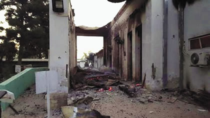 A destroyed area of the Doctors Without Borders hospital in Kunduz, Afghanistan, the morning after the U.S. bombing campaign. |