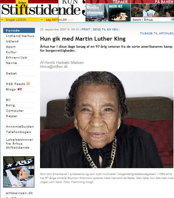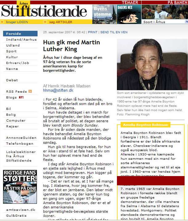 Århus Stiftstidende, one of the two major papers in Århus, Denmark's second largest city, has a big, beautiful picture of Amelia Boynton Robinson, the US civil rights heroine and Schiller Institute leader (see photo, right). The accompanying text covers half of their front page, with another half-page inside, with a headline: "A Lifetime Battle." The picture is captioned: "Civil Rights. In the '60s, she fought with Martin Luther King."