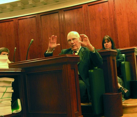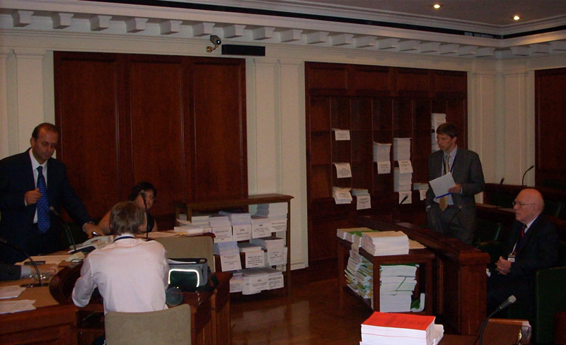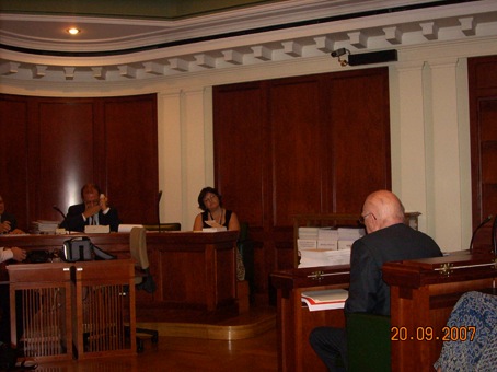 ![]() At the podium: Chairman Treu, an officer of the committe, Liliana Gorini. In the audience: Lyndon and Helga LaRouche. Recording the testimony: Daniel Graseneck Tente. |