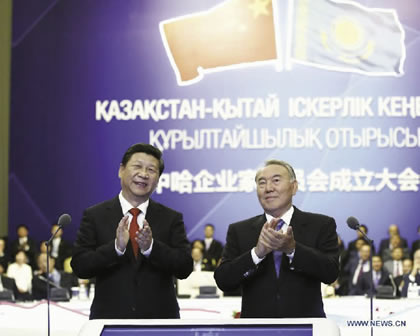 President Xi Jinping announced the One Belt, One Road mutual development policy two years ago while on a visit to Kazakstan. The initiative has grown dramatically since then. Here, President Xi Jinping (left) is standing next to his Kazakstan counterpart Nursultan Nazarbayev, during that 2013 trip. |