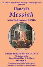 The Schiller Institute New York Community Chorus has now begun a Brooklyn chorus, which will take place at the Church of the Visitation. All are invited to join it, regardless of prior musical knowledge or experience. Our next program at the church is tentatively scheduled for May. Those who wish to support this "New Risorgimento" should subscribe to the Foundation For The Revival Of Classical Culture (www.fftrocc.org) and join the Schiller Institute (schillerinstitute.org). Both organizations want to take this opportunity to thank the Koinonia St. John Baptist, Father Claudio Antecini, and the music ministry headed by Sister Maire, for giving us the opportunity to present Messiah this evening.